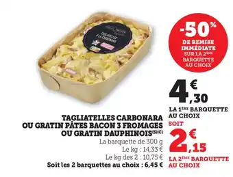 Offre Tagliatelles carbonara ou gratin pâtes bacon 3 fromages soit ou gratin dauphinois chez Bi1