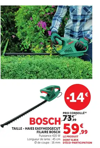 L'offre est disponible dans plusieurs magasins, vérifiez tous les produits pour obtenir le Taille haies easyhedgecut le moins cher. Si vous souhaitez savoir si l'article est en vente avec une plus grosse remise dans un autre magasin, consultez la catégorie 'Supermarché'. Ces offres pourraient aussi vous intéresser : BOSCH Taille - haies easyhedgecut filaire, BOSCH Taille - haies easyhedgecut filaire & Bosch taille-haies easyhedgecut filaire.