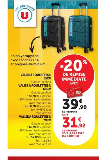 En plus de l'offre U Valise à roulettes, Bi1 propose une large gamme de produits. Consultez le Catalogue Bi1 hebdomadaire pour découvrir les meilleures offres et promotions. En plus de U Valise à roulettes, il y a aussi : U valise à roulettes 55 cm, Valise à roulettes u & Valise à roulettes u.