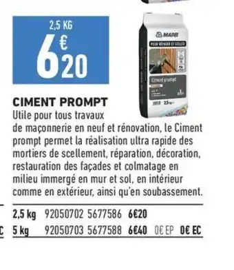 L'offre est disponible dans plusieurs magasins, vérifiez tous les produits pour obtenir le CIMENT PROMPT le moins cher. Si vous souhaitez savoir si l'article est en vente avec une plus grosse remise dans un autre magasin, consultez la catégorie 'Bricolage'. Ces offres pourraient aussi vous intéresser : Ciment nf, Ciment Portland & Ciment cimalit ce.
