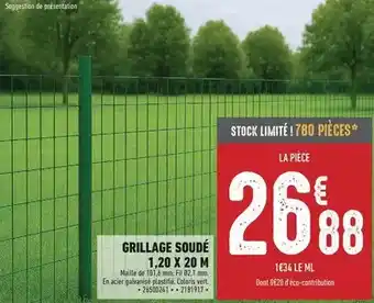 L'offre est disponible dans plusieurs magasins, vérifiez tous les produits pour obtenir le Maille - grillage soude le moins cher. Si vous souhaitez savoir si l'article est en vente avec une plus grosse remise dans un autre magasin, consultez la catégorie 'Bricolage'. Ces offres pourraient aussi vous intéresser : Maille - grillage soude 1,2x20m vert, Rouleau de grillage soudé & Grillage soude 1,2x20m vert.