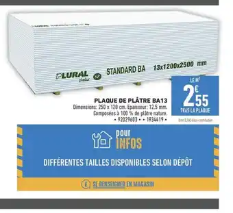 En plus de l'offre Plaque de plâtre ba13, Brico Cash propose une large gamme de produits. Consultez le Catalogue Brico Cash hebdomadaire pour découvrir les meilleures offres et promotions. En plus de Plaque de plâtre ba13, il y a aussi : Plaque de plâtre BA 13-250x120cm, Plaque de plâtre ba13 hydro & Plaque de plâtre BA13 BF.