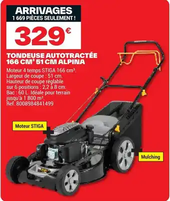 Actuellement en offre chez Brico Dépôt : ALPINA Tondeuse autotractée 166 cm³ ✅ Valable du 17-04 au 30-04.