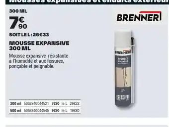 En plus de l'offre BRENNER! Mousse expansive, Brico Dépôt propose une large gamme de produits. Consultez le Catalogue Brico Dépôt hebdomadaire pour découvrir les meilleures offres et promotions. En plus de BRENNER! Mousse expansive, il y a aussi : SIKABOOM Mousse expansive, Brenner - visperie clouterie carton & BRENNER Enduit exterieur pate.