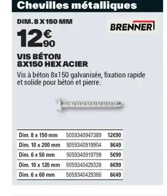 Actuellement en offre chez Brico Dépôt : BRENNER Vis béton 8x150 hex acier ✅ Valable du 25-03 au 12-06.