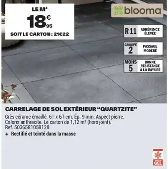En plus de l'offre CARRELAGE DE SOL EXTÉRIEUR QUARTZITE, Brico Dépôt propose une large gamme de produits. Consultez le Catalogue Brico Dépôt hebdomadaire pour découvrir les meilleures offres et promotions. En plus de CARRELAGE DE SOL EXTÉRIEUR QUARTZITE, il y a aussi : Carrelage de sol extérieur, CARRELAGE SOL EXTÉRIEUR VESUVE & Carrelage de sol exterieur tuindra.