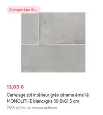 Actuellement en offre chez Brico Dépôt : Carrelage sol intérieur grès cérame émaillé MONOLITHE blanc/gri ✅ Valable du 11-02 au 22-02.