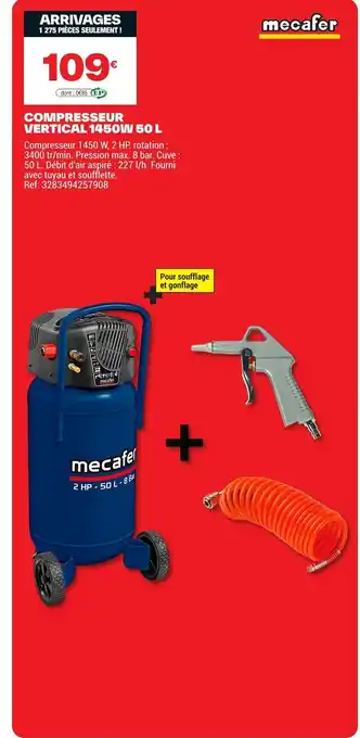 En plus de l'offre Compresseur vertical 1450w 50 l, Brico Dépôt propose une large gamme de produits. Consultez le Catalogue Brico Dépôt hebdomadaire pour découvrir les meilleures offres et promotions. En plus de Compresseur vertical 1450w 50 l, il y a aussi : Mecafer compresseur vertical 50l, Compresseur coaxial quartz 50 l 2 cv & Compresseur coaxial v 100 l 3 cv quartz.