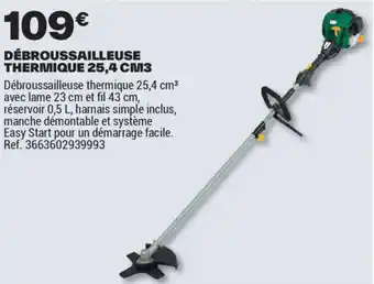 Débroussailleuse thermique 25,4 cm³ avec lame 23 cm et fil 43 cm, réservoir 0,5 L, harnais simple inclus, manche démontable et système Easy Start pour un démarrage facile.