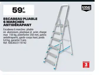 En plus de l'offre Escabeau pliable 6 marches antiderapant, Brico Dépôt propose une large gamme de produits. Consultez le Catalogue Brico Dépôt hebdomadaire pour découvrir les meilleures offres et promotions. En plus de Escabeau pliable 6 marches antiderapant, il y a aussi : Escabeau pliable 5 marches antiderapant, Escabeau 5 Marches & Escabeau marche pied 3 marches.