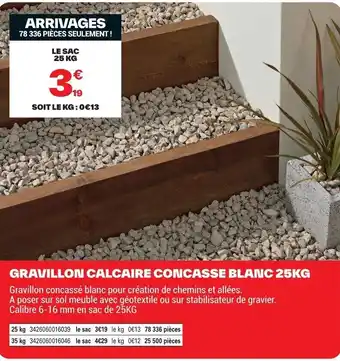 En plus de l'offre Gravillon calcaire concasse blanc, Brico Dépôt propose une large gamme de produits. Consultez le Catalogue Brico Dépôt hebdomadaire pour découvrir les meilleures offres et promotions. En plus de Gravillon calcaire concasse blanc, il y a aussi : Gravillon calcaire concasse blanc 25kg, Gravillon concassé décoratif & Gravillon blanc rosé.