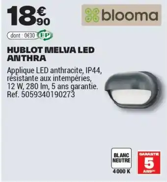 Actuellement, HUBLOT MELVA LED ANTHRA est en promotion chez Brico Dépôt. Toutes les informations utiles comme le prix, les conditions et la durée de validité sont affichées sur cette page. Consultez également les promotions similaires pour HUBLOT MELVA LED ANTHRA, afin de faire le meilleur choix. La promo HUBLOT MELVA LED ANTHRA est valable du 25-03-2026 au 12-06-2026. Si elle est expirée, regardez les autres offres équivalentes. Vous pouvez aussi suivre cette catégorie de produit pour être alerté lorsqu’une nouvelle promotion HUBLOT MELVA LED ANTHRA apparaît chez Brico Dépôt.Questions fréquemment posées au sujet de HUBLOT MELVA LED ANTHRA