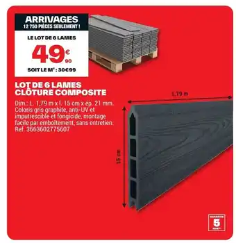Quand Lot de 6 lames clôture composite sera-t-elle en promotion ? Ou encore : "Est-ce que Lot de 6 lames clôture composite sera en promotion la semaine prochaine ?" C’est une question fréquente. Beaucoup de consommateurs établissent leur liste de courses à l’avance. Pour cette raison, nous mettons en ligne les informations sur les promos à venir dès qu’elles sont connues. Cela vous permet de planifier vos achats et de faire de bonnes affaires. Consultez régulièrement notre site pour savoir si une nouvelle promo sur Lot de 6 lames clôture composite arrive bientôt chez Brico Dépôt.Questions fréquemment posées au sujet de Lot de 6 lames clôture composite