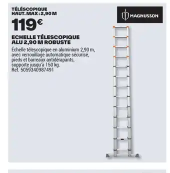 En plus de l'offre MAGNUSSON Echelle télescopique alu 2,90 m robuste, Brico Dépôt propose une large gamme de produits. Consultez le Catalogue Brico Dépôt hebdomadaire pour découvrir les meilleures offres et promotions. En plus de MAGNUSSON Echelle télescopique alu 2,90 m robuste, il y a aussi : MAGNUSSON Echelle télescopique alu 3,80 m robuste, Echelle télescopique alu & Magnusson - téléscopique.