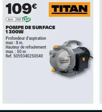 Actuellement en offre chez Brico Dépôt : TITAN Pompe de surface 1300w ✅ Valable du 25-03 au 12-06.