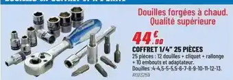 L'offre est disponible dans plusieurs magasins, vérifiez tous les produits pour obtenir le Coffret 1/4 25 pieces le moins cher. Si vous souhaitez savoir si l'article est en vente avec une plus grosse remise dans un autre magasin, consultez la catégorie 'Bricolage'. Ces offres pourraient aussi vous intéresser : Coffret 3/4 17 pièces, Coffret 1/2 23 pieces & Coffret 40 pieces.