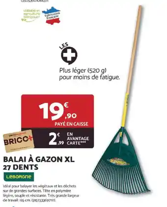 En plus de l'offre Balai à gazon xl 27 dents, Bricomarché propose une large gamme de produits. Consultez le Catalogue Bricomarché hebdomadaire pour découvrir les meilleures offres et promotions. En plus de Balai à gazon xl 27 dents, il y a aussi : Balai à gazon xl duopro 27 dents, Balai à gazon xl & LEBORGNE Balai à gazon XL.