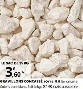 En plus de l'offre GRAVILLONS CONCASSÉ 10/14 MM En calcaireColoris ocre-blanc. Soit le kg: 0,14€. (3760143540333, Bricomarché propose une large gamme de produits. Consultez le Catalogue Bricomarché hebdomadaire pour découvrir les meilleures offres et promotions. En plus de GRAVILLONS CONCASSÉ 10/14 MM En calcaireColoris ocre-blanc. Soit le kg: 0,14€. (3760143540333, il y a aussi : GRAVILLONS CONCASSÉ 10/14 MM, GRAVILLONS CONCASSÉ 10/14 MM & GRAVILLONS CONCASSÉ 10/14 MM.