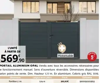 En plus de l'offre PORTAIL ALUMINIUM OPAL, Bricomarché propose une large gamme de produits. Consultez le Catalogue Bricomarché hebdomadaire pour découvrir les meilleures offres et promotions. En plus de PORTAIL ALUMINIUM OPAL, il y a aussi : PORTAIL ALUMINIUM OPAL, PORTAIL COULISSANT OPAL 3,25 M & PORTAIL COULISSANT OPAL.