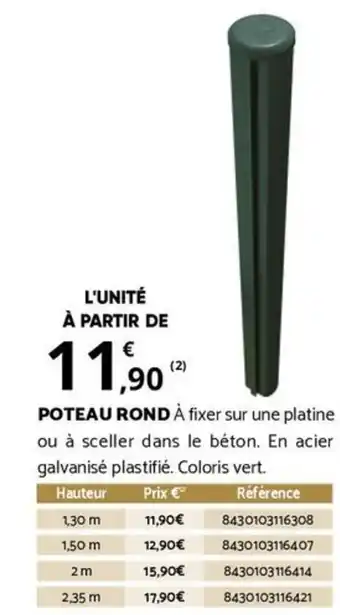 En plus de l'offre POTEAU ROND À, Bricomarché propose une large gamme de produits. Consultez le Catalogue Bricomarché hebdomadaire pour découvrir les meilleures offres et promotions. En plus de POTEAU ROND À, il y a aussi : Poteau rond à sceller pour barrière, POTEAU ROND & Poteau en T.