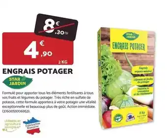 Le prix de l'offre Tous - engrais potage se trouve également en haut de la page, ainsi que la date à laquelle l'offre est disponible. Vous pouvez également vérifier les prix dans le Catalogue Bricomarché actuel ou sur le site Internet de Bricomarché. Les offres vous permettent d'acheter les produits Bricomarché au prix le plus bas.