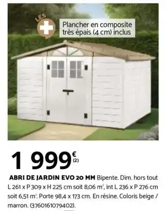 Le prix de l'offre ABRI DE JARDIN EVO se trouve également en haut de la page, ainsi que la date à laquelle l'offre est disponible. Vous pouvez également vérifier les prix dans le Catalogue Bricorama actuel ou sur le site Internet de Bricorama. Les offres vous permettent d'acheter les produits Bricorama au prix le plus bas.