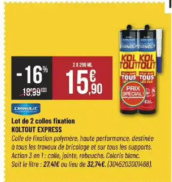 Actuellement en offre chez Bricorama : CYANOLIT Lot de 2 colles fixation KOLTOUT EXPRESS ✅ Valable du 4-03 au 15-03.