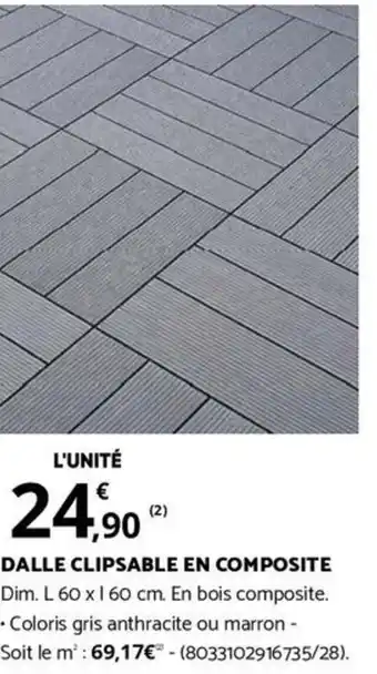 En plus de l'offre DALLE CLIPSABLE EN COMPOSITE, Bricorama propose une large gamme de produits. Consultez le Catalogue Bricorama hebdomadaire pour découvrir les meilleures offres et promotions. En plus de DALLE CLIPSABLE EN COMPOSITE, il y a aussi : DALLE CLIPSABLE EN COMPOSITE, DALLE COMPOSITE "NEILIO" & Dalle composite neiglio 40x40 cm.