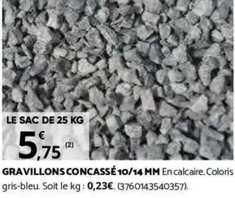 En plus de l'offre GRAVILLONS CONCASSÉ 10/14 MM, Bricorama propose une large gamme de produits. Consultez le Catalogue Bricorama hebdomadaire pour découvrir les meilleures offres et promotions. En plus de GRAVILLONS CONCASSÉ 10/14 MM, il y a aussi : GRAVILLONS CONCASSÉ 10/14 MM, GRAVILLONS CONCASSÉ 10/14 MM & GRAVILLONS CONCASSÉ 10/14 MM En calcaireColoris ocre-blanc. Soit le kg: 0,14€. (3760143540333.
