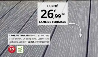 En plus de l'offre LAME DE TERRASSE, Bricorama propose une large gamme de produits. Consultez le Catalogue Bricorama hebdomadaire pour découvrir les meilleures offres et promotions. En plus de LAME DE TERRASSE, il y a aussi : Lame de terrasse, LAME DE TERRASSE & LAME DE TERRASSE.