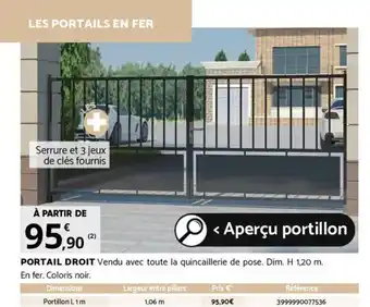 Cette PORTAIL DROIT est maintenant disponible chez Bricorama. Découvrez toutes les promos en cours et profitez de réductions intéressantes. Commandez PORTAIL DROIT en ligne via le site officiel de Bricorama ou achetez-la en magasin à un prix avantageux. Promocatalogues.fr réunit chaque jour les meilleures offres liées à PORTAIL DROIT. Envie d’être informé en premier ? Activez l’alerte en cliquant sur la cloche pour recevoir une notification gratuite dès que ce produit revient en promotion.Questions fréquemment posées au sujet de PORTAIL DROIT