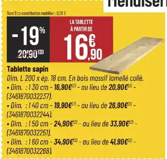 Actuellement, Tablette sapin est en promotion chez Bricorama. Toutes les informations utiles comme le prix, les conditions et la durée de validité sont affichées sur cette page. Consultez également les promotions similaires pour Tablette sapin, afin de faire le meilleur choix. La promo Tablette sapin est valable du 22-04-2026 au 03-05-2026. Si elle est expirée, regardez les autres offres équivalentes. Vous pouvez aussi suivre cette catégorie de produit pour être alerté lorsqu’une nouvelle promotion Tablette sapin apparaît chez Bricorama.Questions fréquemment posées au sujet de Tablette sapin