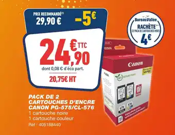 Actuellement en offre chez Bureau Vallée : Canon pack de 2 cartouches d'encre pg-575/cl-576 ✅ Valable du 5-01 au 24-01.