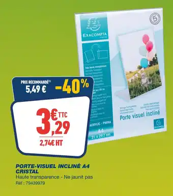 Actuellement en offre chez Bureau Vallée : Exacompta porte-visuel incliné a4 cristal ✅ Valable du 23-02 au 14-03.