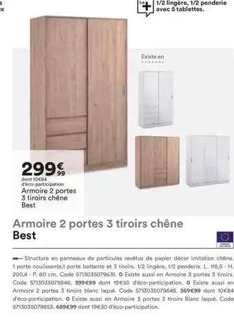 Le prix de l'offre Armoire 2 portes 3 tiroirs chêne Best se trouve également en haut de la page, ainsi que la date à laquelle l'offre est disponible. Vous pouvez également vérifier les prix dans le Catalogue BUT actuel ou sur le site Internet de BUT. Les offres vous permettent d'acheter les produits BUT au prix le plus bas.