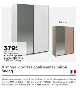 Armoire 2 portes coulissantes miroir l150 cm swing offres et promotions en ligne chez BUT