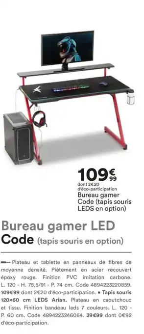 Quand Bureau gamer LED sera-t-elle en promotion ? Ou encore : "Est-ce que Bureau gamer LED sera en promotion la semaine prochaine ?" C’est une question fréquente. Beaucoup de consommateurs établissent leur liste de courses à l’avance. Pour cette raison, nous mettons en ligne les informations sur les promos à venir dès qu’elles sont connues. Cela vous permet de planifier vos achats et de faire de bonnes affaires. Consultez régulièrement notre site pour savoir si une nouvelle promo sur Bureau gamer LED arrive bientôt chez BUT.Questions fréquemment posées au sujet de Bureau gamer LED