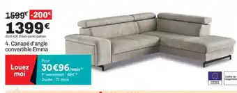 Actuellement, Canapé d'angle convertible Emma est en promotion chez BUT. Toutes les informations utiles comme le prix, les conditions et la durée de validité sont affichées sur cette page. Consultez également les promotions similaires pour Canapé d'angle convertible Emma, afin de faire le meilleur choix. La promo Canapé d'angle convertible Emma est valable du 03-02-2026 au 02-03-2026. Si elle est expirée, regardez les autres offres équivalentes. Vous pouvez aussi suivre cette catégorie de produit pour être alerté lorsqu’une nouvelle promotion Canapé d'angle convertible Emma apparaît chez BUT.Questions fréquemment posées au sujet de Canapé d'angle convertible Emma