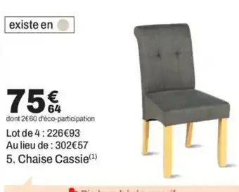 L'offre est disponible dans plusieurs magasins, vérifiez tous les produits pour obtenir le Chaise Cassie le moins cher. Si vous souhaitez savoir si l'article est en vente avec une plus grosse remise dans un autre magasin, consultez la catégorie 'Meubles & Décoration'. Ces offres pourraient aussi vous intéresser : Chaise, Chaise Jenna & Chaise Agathe.