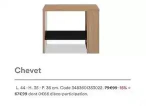 L'offre est disponible dans plusieurs magasins, vérifiez tous les produits pour obtenir le Chevet le moins cher. Si vous souhaitez savoir si l'article est en vente avec une plus grosse remise dans un autre magasin, consultez la catégorie 'Meubles & Décoration'. Ces offres pourraient aussi vous intéresser : Chevet 1 tiroir, Chevet 'nora' & Chevet 1 tiroir Eliot.