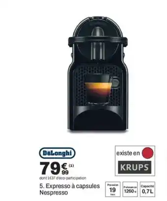 L'offre est disponible dans plusieurs magasins, vérifiez tous les produits pour obtenir le DELONGHI Expresso à capsules Nespresso le moins cher. Si vous souhaitez savoir si l'article est en vente avec une plus grosse remise dans un autre magasin, consultez la catégorie 'Meubles & Décoration'. Ces offres pourraient aussi vous intéresser : DELONGHI Expresso avec broyeur, Delonghi expresso broyeur & Delonghi - machine expresso team 220 22.69t.