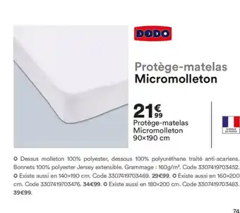 En plus de l'offre DODO Protège-matelas Micromolleton, BUT propose une large gamme de produits. Consultez le Catalogue BUT hebdomadaire pour découvrir les meilleures offres et promotions. En plus de DODO Protège-matelas Micromolleton, il y a aussi : DODO Protège-matelas Micromolleton, Dodo - protège-matelas micromolleton 90x190 cm & Dodo - protège-matelas 30.