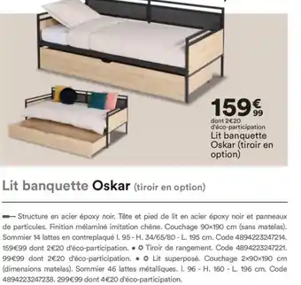 L'offre est disponible dans plusieurs magasins, vérifiez tous les produits pour obtenir le Lit banquette Oskar le moins cher. Si vous souhaitez savoir si l'article est en vente avec une plus grosse remise dans un autre magasin, consultez la catégorie 'Meubles & Décoration'. Ces offres pourraient aussi vous intéresser : Tête de lit Oskar, Banquette-lit 3 places Jill & Banquette-lit BZ Yael.