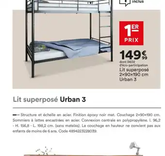 Le prix de l'offre Lit superposé Urban 3 se trouve également en haut de la page, ainsi que la date à laquelle l'offre est disponible. Vous pouvez également vérifier les prix dans le Catalogue BUT actuel ou sur le site Internet de BUT. Les offres vous permettent d'acheter les produits BUT au prix le plus bas.