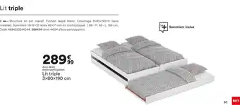 L'offre est disponible dans plusieurs magasins, vérifiez tous les produits pour obtenir le Lit triple le moins cher. Si vous souhaitez savoir si l'article est en vente avec une plus grosse remise dans un autre magasin, consultez la catégorie 'Meubles & Décoration'. Ces offres pourraient aussi vous intéresser : Bière triple triple lefort, Triple lefort bière triple & BIÈRE TRIPLE TRIPLE LEFORT.