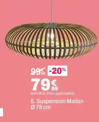 L'offre est disponible dans plusieurs magasins, vérifiez tous les produits pour obtenir le Suspension Mailan le moins cher. Si vous souhaitez savoir si l'article est en vente avec une plus grosse remise dans un autre magasin, consultez la catégorie 'Meubles & Décoration'. Ces offres pourraient aussi vous intéresser : Suspension Lindset, La suspension aliya & Suspension Camille 2.