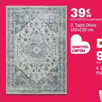 L'offre est disponible dans plusieurs magasins, vérifiez tous les produits pour obtenir le Tapis Olivia le moins cher. Si vous souhaitez savoir si l'article est en vente avec une plus grosse remise dans un autre magasin, consultez la catégorie 'Meubles & Décoration'. Ces offres pourraient aussi vous intéresser : Tapis, Tapis & Le tapis.