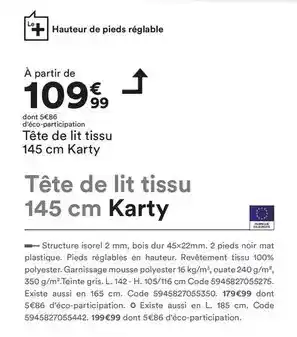 Le prix de l'offre Tête de lit tissu 145 cm karty se trouve également en haut de la page, ainsi que la date à laquelle l'offre est disponible. Vous pouvez également vérifier les prix dans le Catalogue BUT actuel ou sur le site Internet de BUT. Les offres vous permettent d'acheter les produits BUT au prix le plus bas.