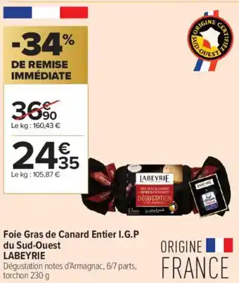 Offre LABEYRIE Foie Gras de Canard Entier I.G.P du Sud-Ouest chez Carrefour Contact