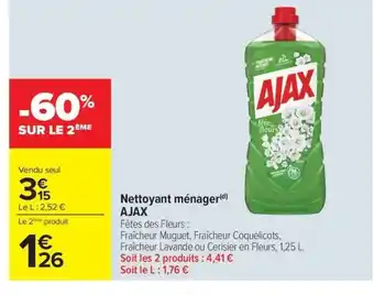 AJAX Nettoyant ménager bénéficie actuellement d'une réduction chez Carrefour Drive. Vous trouverez ici toutes les infos utiles sur les prix, la durée de validité et les conditions de l’offre. Pensez à consulter aussi d'autres offres et promotions similaires pour AJAX Nettoyant ménager afin d’acheter toujours au bon prix. La promo AJAX Nettoyant ménager est valable du 28-04-2026 au 11-05-2026. Offre terminée ? Pas de souci. D'autres offres sur ces produits sont peut-être déjà disponibles. Vous pouvez suivre cette catégorie de produits pour rester informé en cas de nouvelle promotion AJAX Nettoyant ménager chez Carrefour Drive. En comparant les offres, vous êtes sûr d’acheter au prix le plus bas possible.Questions fréquemment posées au sujet de AJAX Nettoyant ménager